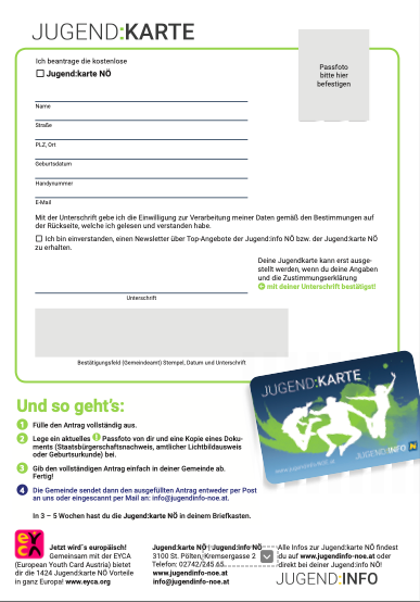 Seit Anfang 2003 gibt es nun schon die kostenlose Jugend:karte NÖ für junge Niederösterreicher:innen zwischen 14 und 24 Jahren. Neben einem Altersnachweis gemäß niederösterreichischem Jugendgesetz bietet sie auch noch zahlreiche weitere Vorteile und ist sowohl im Scheckkartenformat als auch digital erhältlich!